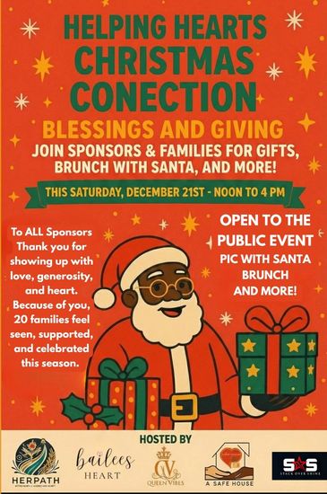 DECEMBER 21ST NOON-4PM It's a festive, family-friendly community event focused on spreading love, generosity, and holiday cheer. Open to the public, the event includes brunch with Santa, gift giving, photos, and fun activities for all ages. Thanks to our sponsors, 20 families will be supported and celebrated this season.